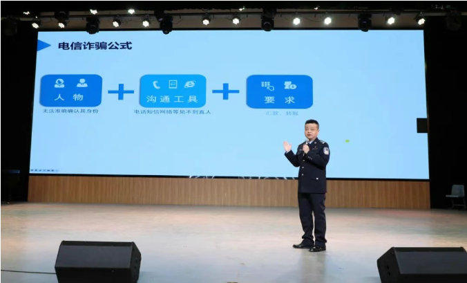 刑侦大队副大队长杨剑鸣精准锁定“刷单返利”、“虚假交易”、“注销校园贷”等大学生群体高发的骗局,通过模拟场景、解析话术等方式揭秘不同类型电诈的套路伎俩,用真实事件提醒同学们擦亮眼睛,不要被诈骗分子所谓“高薪兼职”诱惑,沦为“电诈工具人”。最后给出了有针对性的应对防范指南,提升大家识诈、防诈、反诈的能力,牢牢守护好自己的钱袋子和人身安全。
