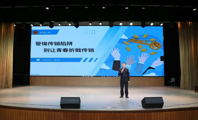 “‘轻轻松松月入过万?带你实现财富自由?’面对这些诱人的口号,你是否能保持清醒?这背后又藏着怎样的陷阱?”杜桥派出所二级警长薛欣恺发人深省的提问吸引了在座学生们的注意。他深入浅出地讲解了传销的定义、本质特征以及危害性,通过剖析真实案例,用“身边事”警醒“身边人”,为大家撕碎传销“一夜暴富”的虚假外衣,帮助学生们擦亮明辨是非的眼睛,教育引导大家树立正确的成才观、就业观,学会辨别和远离传销陷阱,在人生求职道路上走稳走正。